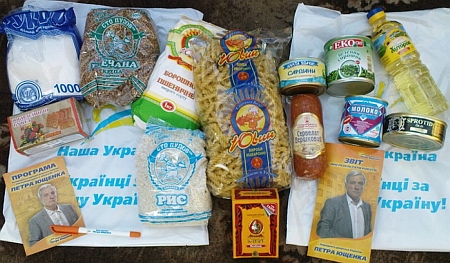 В пакетах с логотипом партии «Наша Украина» раздавали палку колбасы, консервную банку шпрот, консервную банку сардин, бутылку масла, пачку печенья, пачку макарон, пачку муки, пачку риса, пачку гречки, 1 кг. сахара, пачку чая, пачку кофе, сгущенное молоко, банку зеленого горошка.