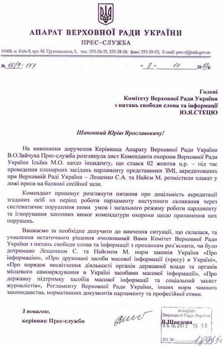 Причиной стало письмо коменданта охраны Ильина М.О. относительно «инцидента, что произошел 2 октября – во время заседания Лещенко и Найем разместили плакат в ложе прессы на балконе сессионного зала».