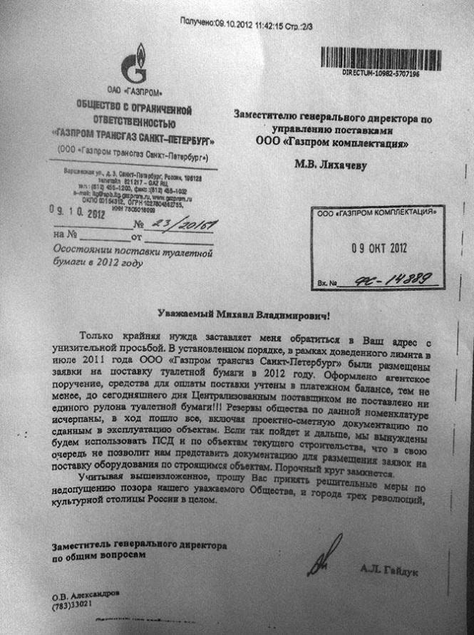 Из письма, которое больше похоже на крик о помощи, следует, что питерская «дочка» «Газпрома» в текущем году не получила ни единого рулона туалетной бумаги. Вследствие этого сотрудники компании вынуждены вместо нее использовать проектно-сметную документацию по введенным объектам, и даже грозятся, что если ситуация не исправится – в ход пойдет документация по строящимся объектам. В связи с этим, руководство «дочки» просит в срочном порядке прислать туалетную бумагу и не допустить позора компании и города трех революций.