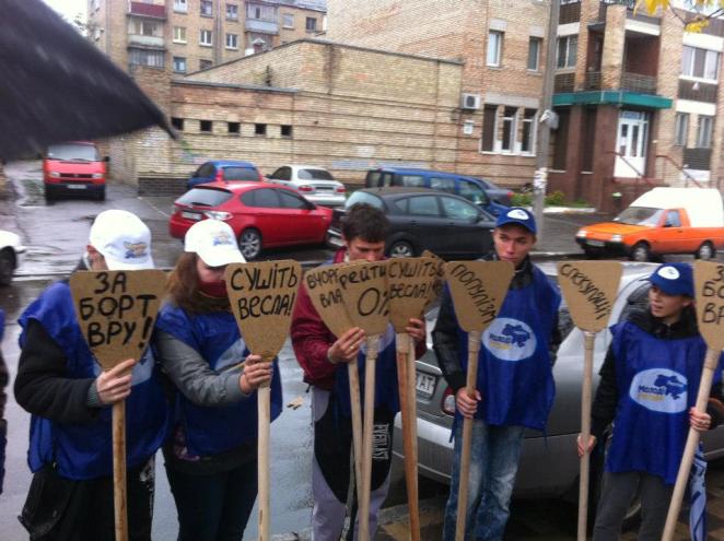 Группа молодых людей (7 человек) в накидках от «Молодой Партии регионов» сегодня утром пришли к офису Киевского штаба Объединенной оппозиции «Батькивщина». В руках они держали весла с надписями «ЗА борт ВРУ», «Сушите весла», «рейтинг 0%» и тому подобное. Об этом сообщает пресс-центр Киевского регионального штаба Объединенной оппозиции.