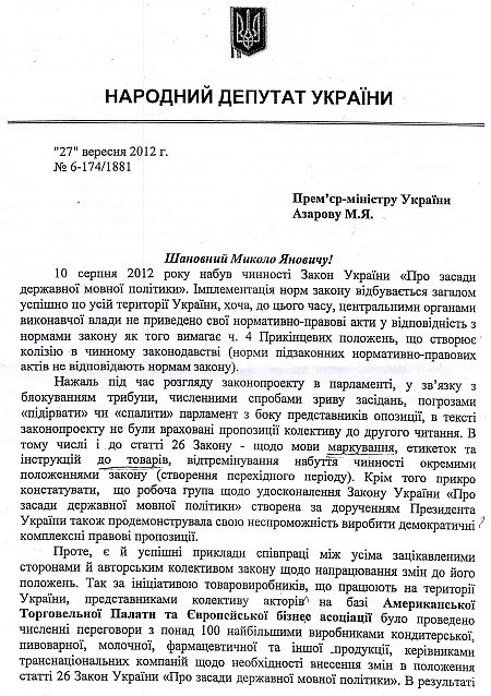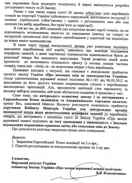 Колесниченко просит не штрафовать производителей товаров за язык (документ)