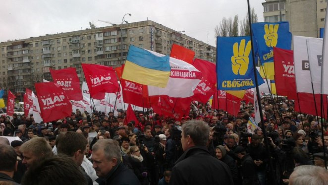 Они держат флаги своих партий и скандируют «Януковича геть!», «Бандита геть!», «Криминал», а также выкрикивают фамилии мажоритарщиков, которые победили на выборах.