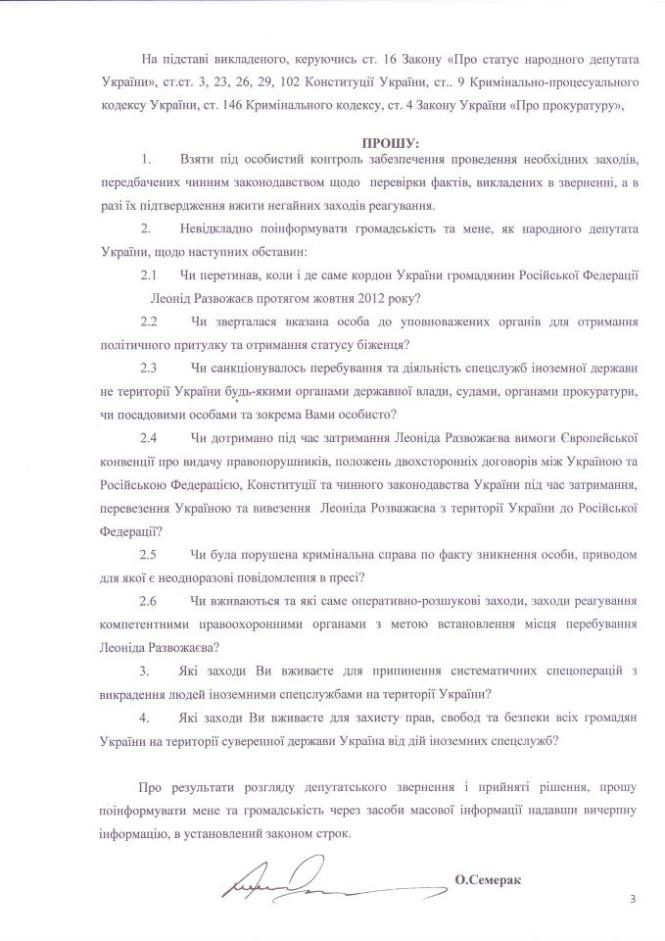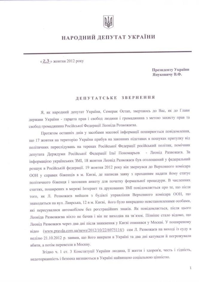 «Сегодня обратился к президенту Януковичу с требованием прекратить систематические похищения людей на территории Украины и защиты прав и свобод граждан Украины и других государств, которые гарантированы Конституцией Украины, международными соглашениями и законами суверенного государства, Украина. Это явление стало систематическим и несет угрозу безопасности людей и государства», - пишет депутат.