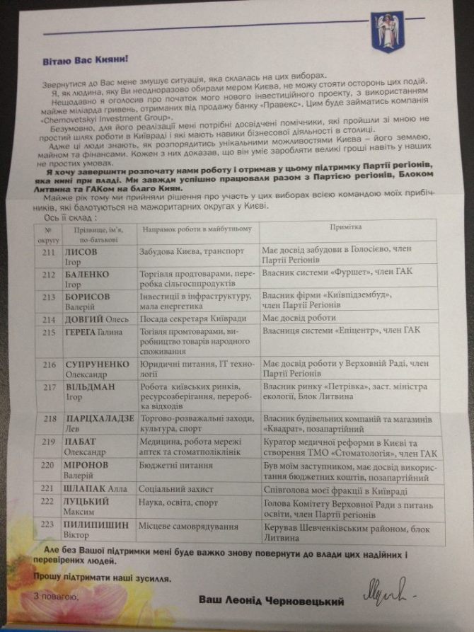 «Ведь эти люди знают, как распорядиться уникальными возможностями Киева – его землей, имуществом и финансами. Каждый из них досказал, что он умеет зарабатывать большие деньги даже в наших непростых условиях. Я хочу завершить начатую нами работу и получил в этом поддержку Партии регионов, которая в настоящее время при власти. Мы всегда успешно работали вместе с Партией регионов, Блоком Литвина и ГАКом, на благо Киева», идет речь в письме с подписью Леонида Черновецкого.