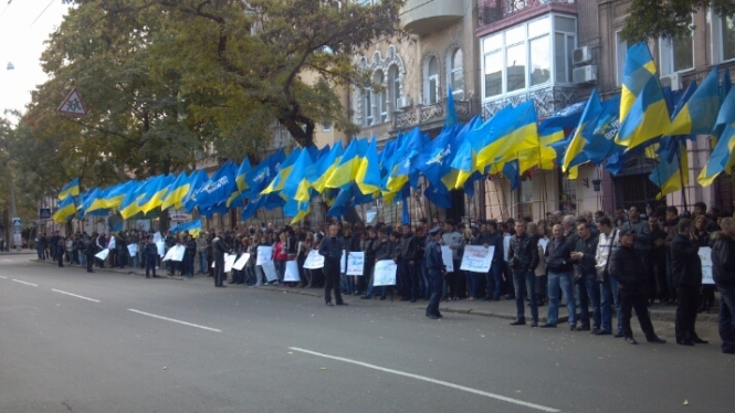 Митинг возмущенных инвесторов «Прогресс-строя» встречает президента Украины Виктора Януковича у здания кукольного театра в Одессе, который он должен открыть.