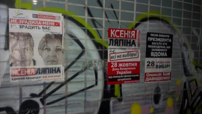 В Дарницком районе Киева, где баллотируется кандидат от Объединенной оппозиции Ксения Ляпина, неизвестные расклеили провокационные листовки против этого кандидата. На плакатах рядом с Ксенией Ляпиной изображен Виктор Ющенко и подпись: «Не предала меня - не предаст вас».