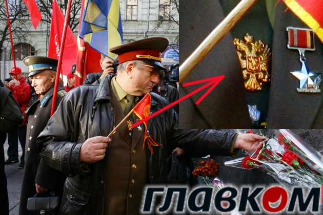 Сегодня в Киеве на Бессарабской площади собрались около 3-х тысяч сторонников Компартии. Фотокамера «Главкома» среди собравшихся зафиксировала людей в форме, на которой была символика Российской федерациии и СССР. В частности герб соседней страны.