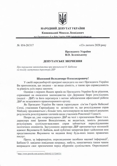 Він повідомив, що надіслав відповідне звернення до президента Зеленського щодо порушення законодавства при призначенні Бабікова на посаду першого заступника директора ДБР. Княжицький, зокрема, посилається на журналістське розслідування програми «Слідство. інфо», яке доводить активне залучення Бабікова до захисту Януковича.