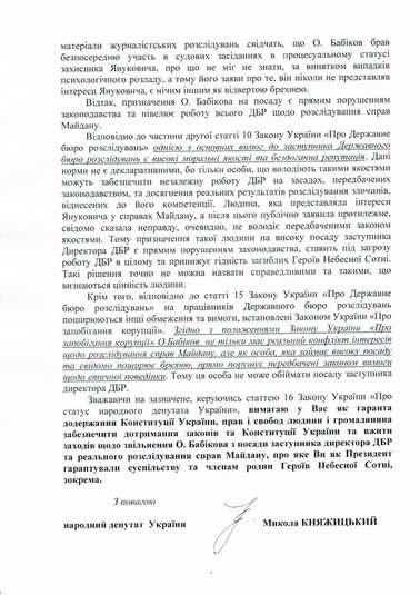 Княжицький також опублікував звернення до президента щодо порушення законодавства під час призначення Бабікова.