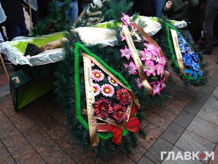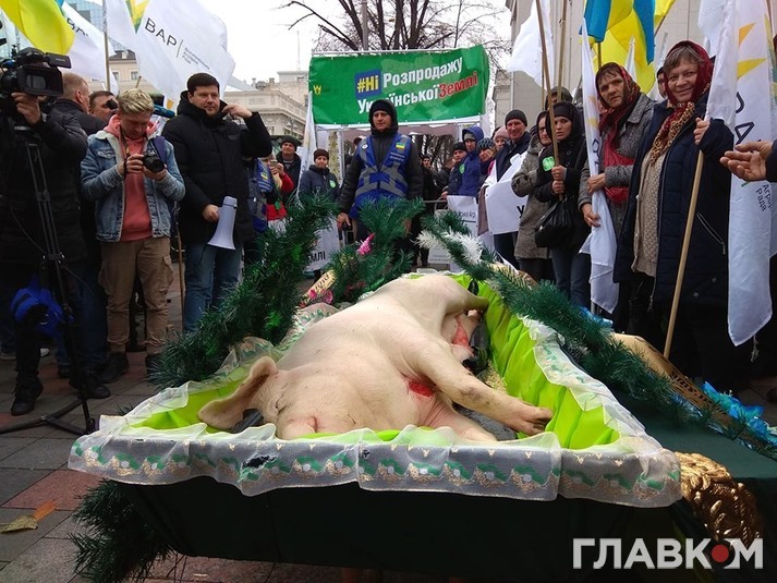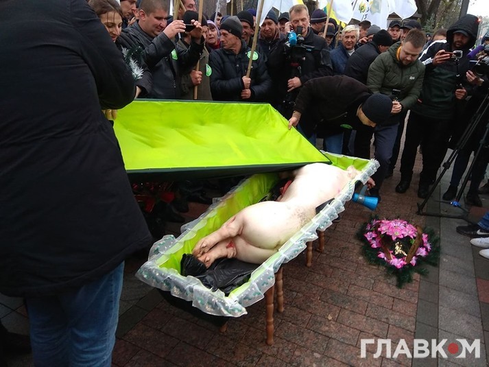 Селяни принесли під Верховну Раду тушу свині у труні, що символізує смерть сільського господарства у разі прийняття законопроєкту №2178 про запуск ринку землі.