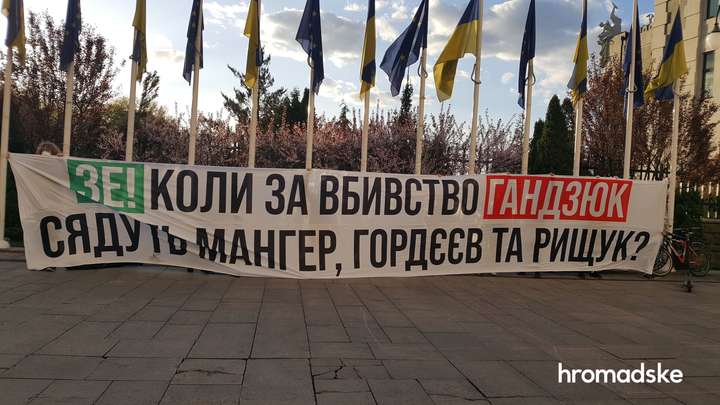 Під Офісом президента України активісти ініціативи «Хто замовив Катю Гандзюк?» влаштували акцію протесту, вимагають пояснень від Володимира Зеленського та звільнення генпрокурорки Ірини Венедіктової через завершення досудового слідства у справі Катерини Гандзюк.