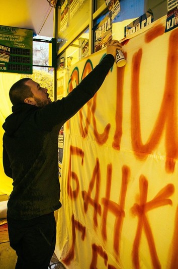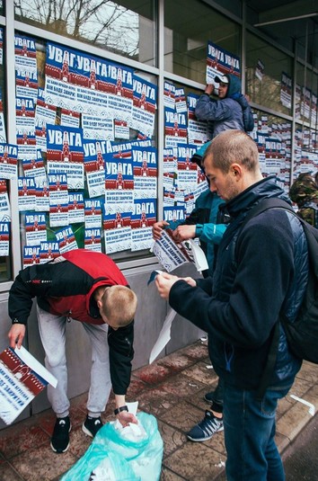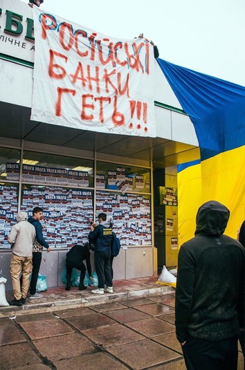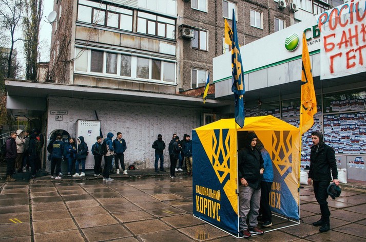 «Після тижневої перерви в блокаді російського «Сбербанку» в центрі Дніпра, під час якої у вкладників була можливість забрати свої гроші, Національний Корпус починає новий етап акцій проти банків країни-агресора. Сьогодні вранці, не дивлячись на дощ, 50 активістів прийшли до центрального відділення Сбербанку в Дніпрі, розклеїли його інформаційними стікерами із закликами забирати гроші, вивісили величезний прапор України, який демонструє, що цей ворожий банк знаходиться на нашій землі, і продовжують пікет», - йдеться у повідомленні.