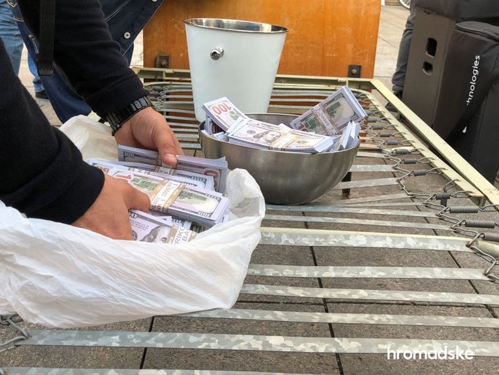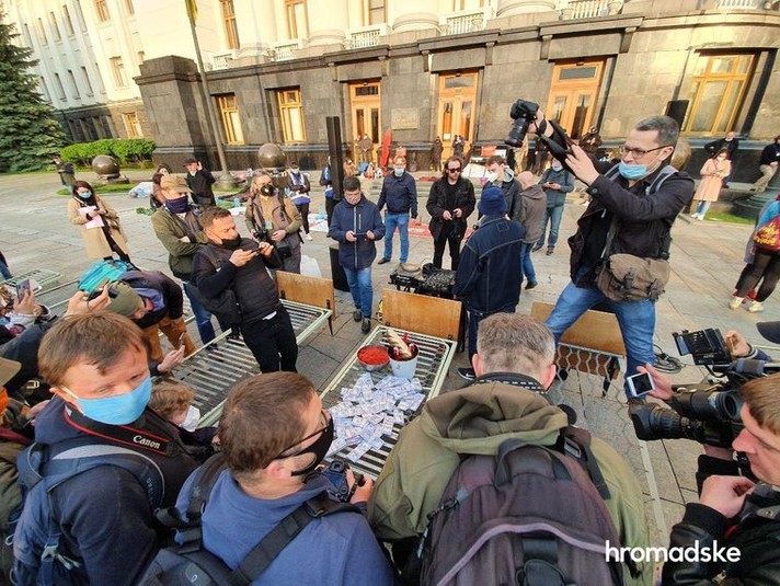Золотий батон, ікра та гроші: на Банковій влаштували акцію проти глави МОЗ Максима Степанова, який закупив дорогі захисні костюми для лікарів pic.twitter.com/H6CQkzdP4k