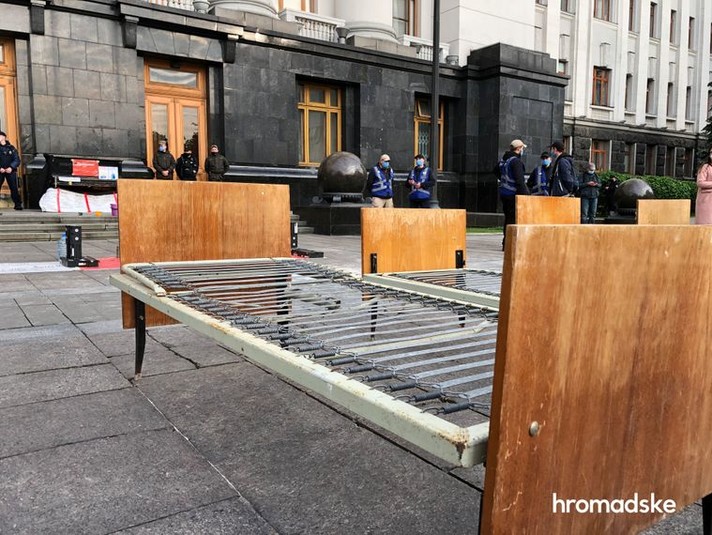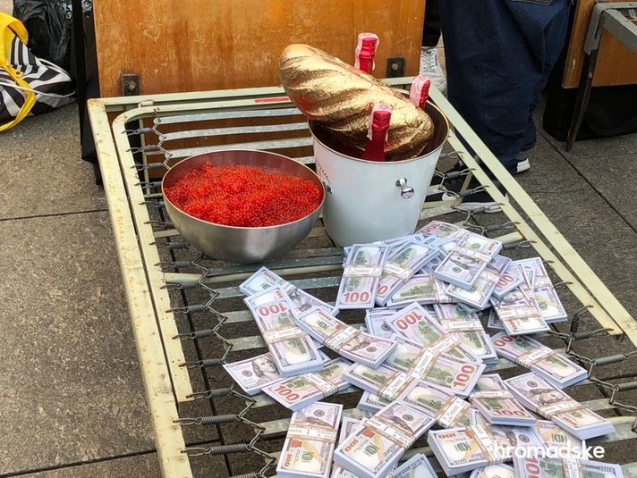 Перед Офісом президента поставили старі пусті ліжка, які символізують пацієнтів і лікарні, яким не вистачає засобів захисту. Також тут вбув діджейський пульт, сухий лід, шампанське, несправжні гроші та ікра, золотий батон, корона тощо.