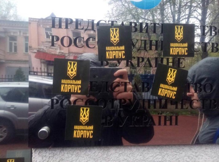 Представники партії «Національний корпус» провели акцію під Російським центром науки і культури в Києві, щоб завадити проведенню освітньої акції «Тотальний диктант», в якій мали б брати участь представники «Л/ДНР».