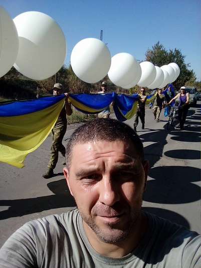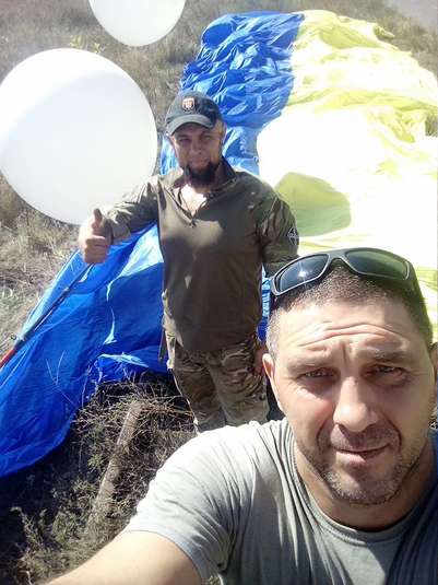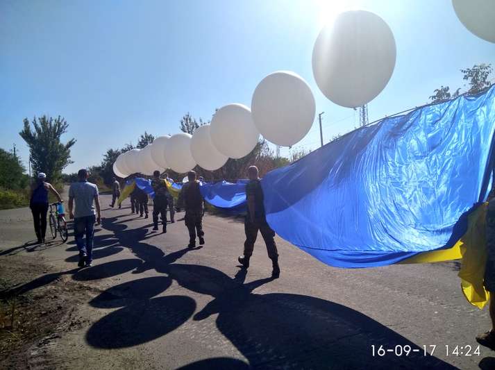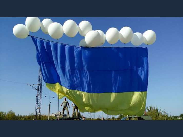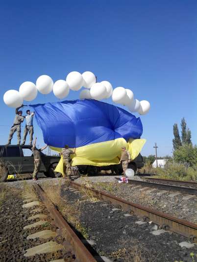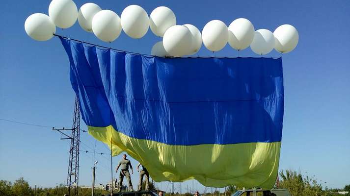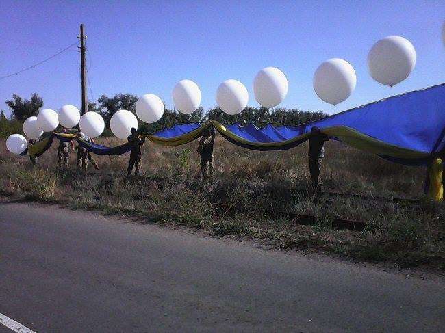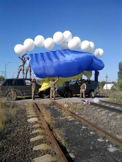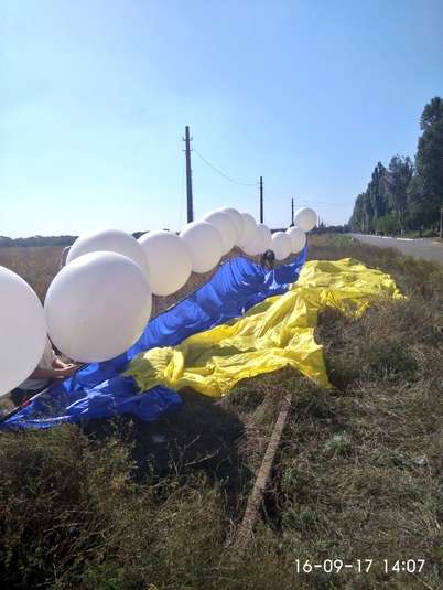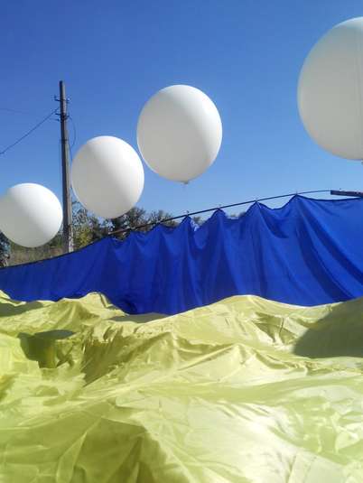 На фото видно, що активісти запустили прапор України на білих повітряних кулях.