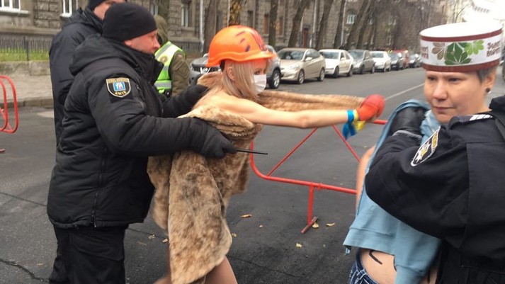 Учасниці руху Femen оголилися на вулиці Банковій, прямо біля поліцейського кордону на підході до Адміністрації президента. Свою акцію активістки приурочили до Дня Гідності та Свободи, який відзначають 21 листопада у річницю початку Євромайдана.