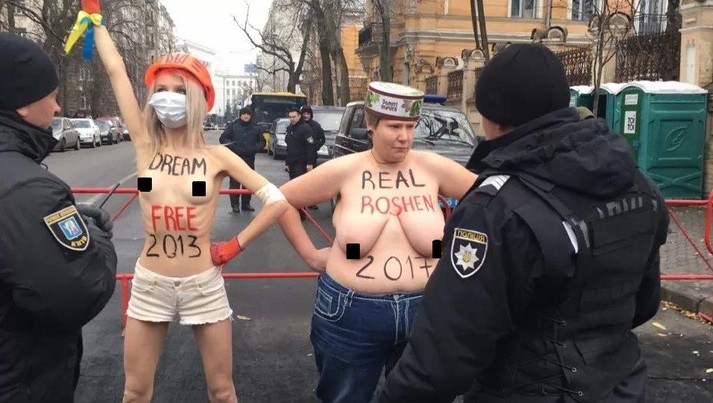 Зокрема, дві активістки оголили груди, на їх тілах були написані гасла: Dream 2013 - Free і та Real 2017 - Roshen.