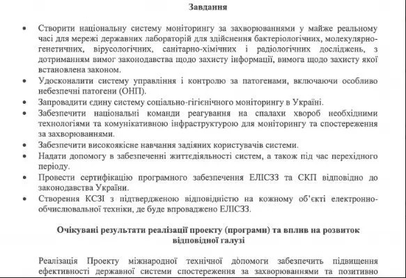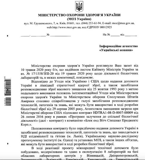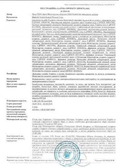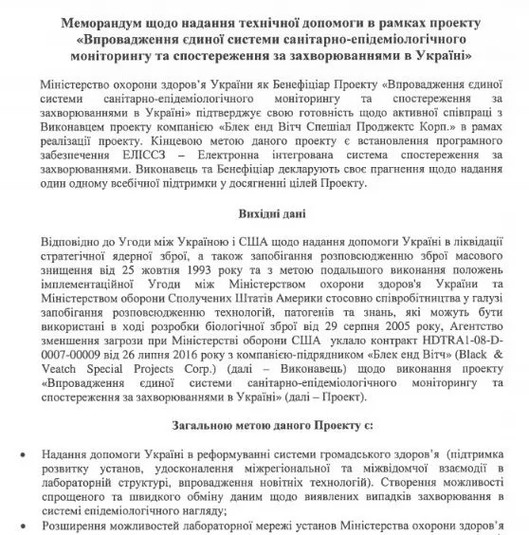 «Положеннями контракту було передбачено надання допомоги Україні в запобіганні розповсюдженню технологій, патогенів та знань, які знаходяться в НДІ епідемології та гігієни (Львів), Українському науково-дослідному протичумному інституті (Одеса) та установах МОЗ, а також на інших об'єктах , які можуть бути використані в ході розробки біологічної зброї», - йдеться у відповіді.