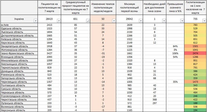 За темпами госпіталізацій на перші місця виходять області з найбільшою чисельністю населення: Київ, Одеська область (швидкість 57 (+33) ліжка/день), Львівська, Дніпропетровська, Київська, Харківська області.
