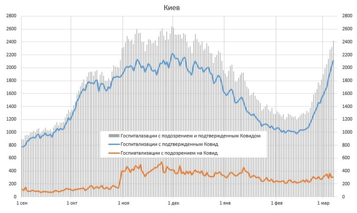 «Окремо хочу пояснити, що коли завтра ви в звіті Степанова побачите добові госпіталізації 2136, не думайте радіти, тому що виписок було в той день на 960 менше, отже стільки пацієнтів зайняли нові ліжка, а так само подивіться що було три тижні тому. А три тижні тому було госпіталізацій 1144 за добу, тобто майже на 1000 менше. Така ж ситуація і по Києву», – зазначає експерт.
