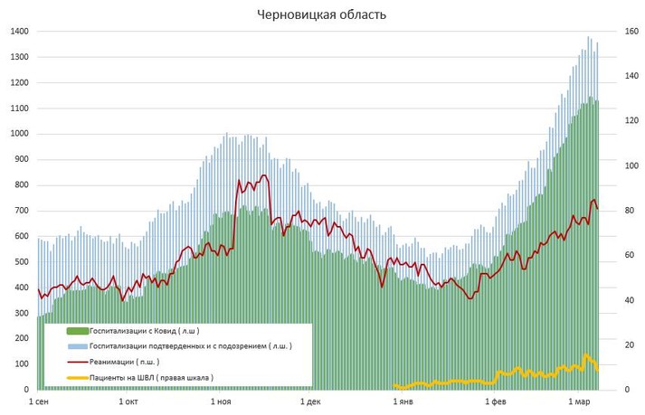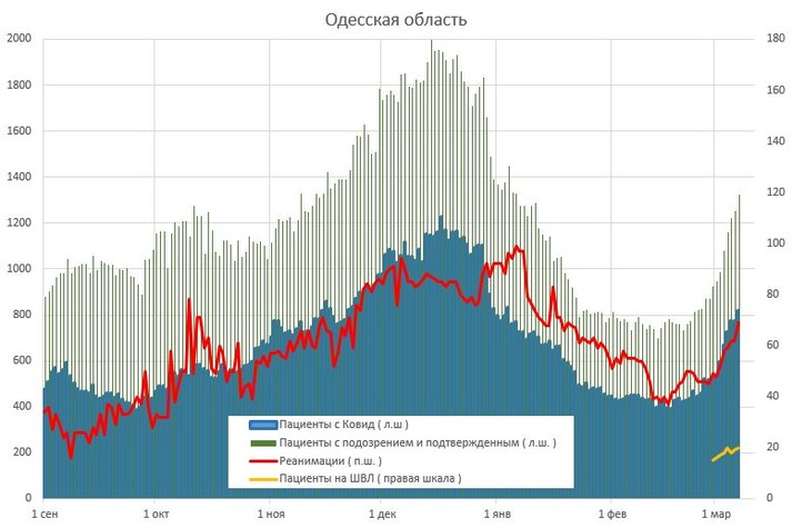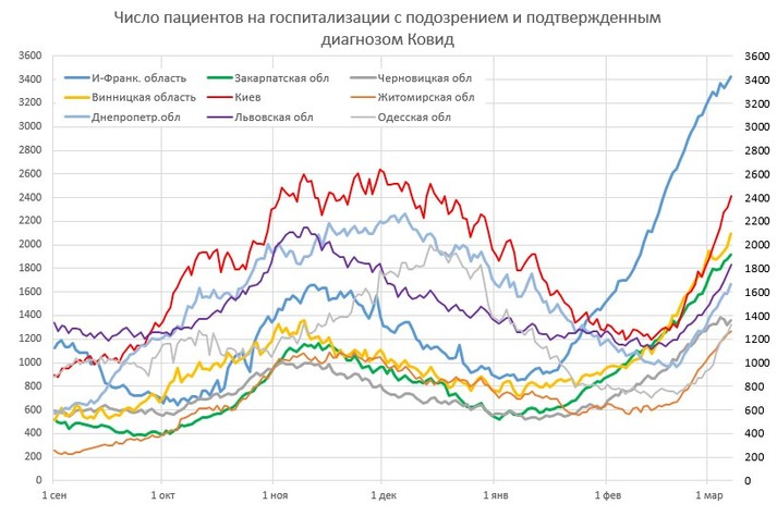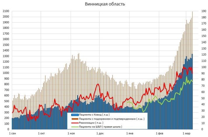 «Києву до максимуму осені залишилося три дні, вчора (6 березня) заповнили 95 ліжок, тижнева швидкість 85 ліжка/день. Тижнем раніше було на 22 менше, 63 ліжка/день. Вінницька область, за добу +111 ліжок. Всього зайнято 2093. За кількістю зайнятих ліжок третє місце по Україні, після Івано-Франківська і Києва», – додав Істребін.