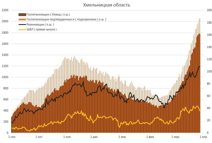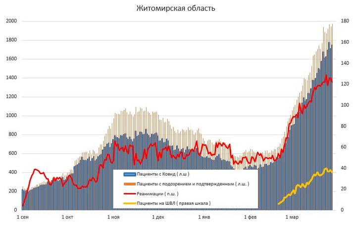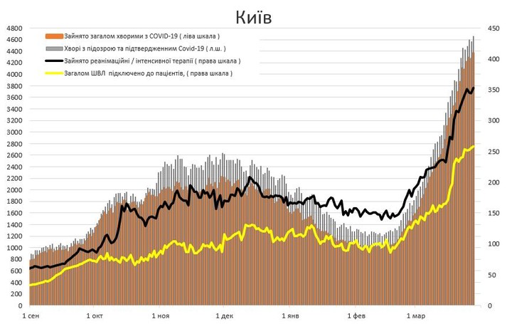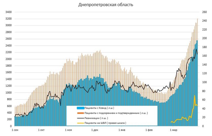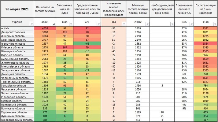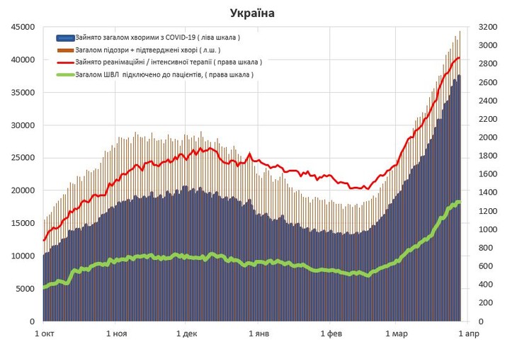 Ріст захворюваності на Covid-19 триває в масштабах всієї країни. Як повідомляє мережевий експерт з «ковідної» статистики Євген Істребін, упродовж минулої доби було заповнене ще 1345 ліжкомісць у лікарнях України. Станом на 28 березня у країні нараховується 44371 пацієнт з підозрою і непідтвердженим діагнозом (+1345) 37542 пацієнти з підтвердженим діагнозом (+1086). Всього в реанімаціях перебуває 3073 осіб (+15), на апаратах штучної вентиляції легень Всього на ШВЛ – 1297 (-5)