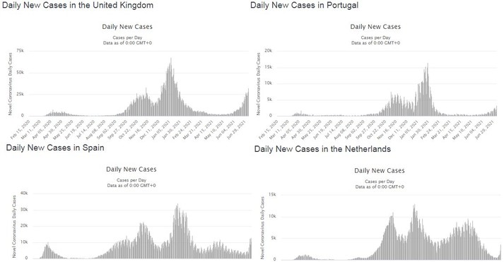 Найбільше число випадків за останні сім днів зафіксовано: Великобританія – 2800, Іспанія – 1904, Португалія – 1620, Греція – 820, Нідерланди – 668.