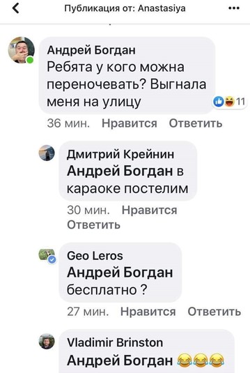 У коментарях до публікації з'явився Андрій Богдан. «Агов, друзі, у кого можна переночувати? Вигнала мене на вулицю», - пожартував Богдан.