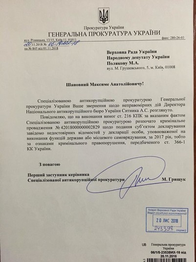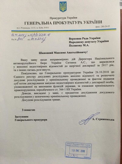 Кримінальна справа була зареєстрована за заявою нардепа від «Народного фронту» Максима Полякова. Він оприлюднив на Facebook відповідь САП, у якій йдеться про порушення справи.