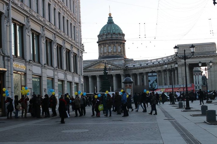 Зокрема, в російському Санкт-Петербурзі активісти зібралися з плакатами і повітряними кулями жовтого і блакитного кольору. Активіст руху «СПб Солідарність» прийшов з табличкою «За вашу і нашу свободу».