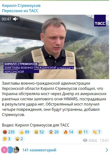 Коментарі під відео ушкоджень на мосту, яким поділився у Telegram-каналі один із гауляйтерів Херсонської області Кирило Стремоусов, теж невтішні для поціновувачів дій РФ. Його читачі почали підозрювати, що все далеко не так, як їм намагаються донести «головні» колаборанти.