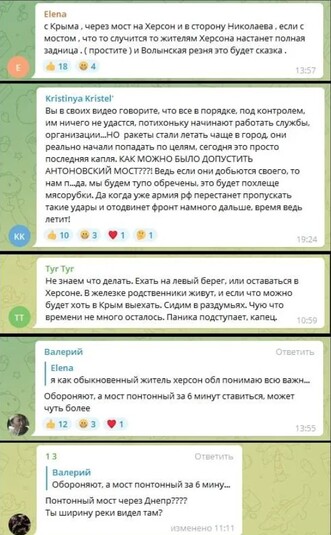 «Не знаємо що робити. Їхати на лівий берег чи залишатися в Херсоні? Є родичі, можна буде до Криму виїхати. Сидимо в роздумах. Чую, що часу не багато залишилося, паніка підступає», – написали шанувальники «русского міра»