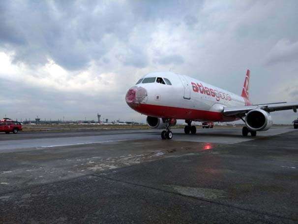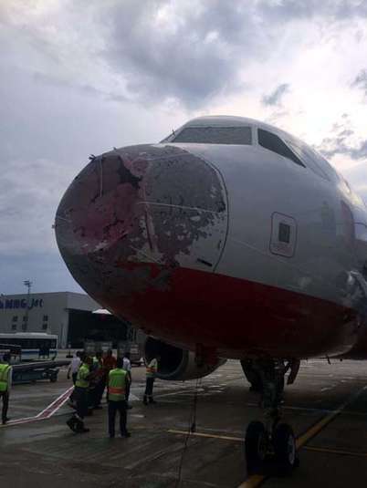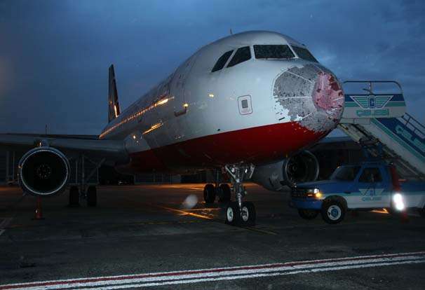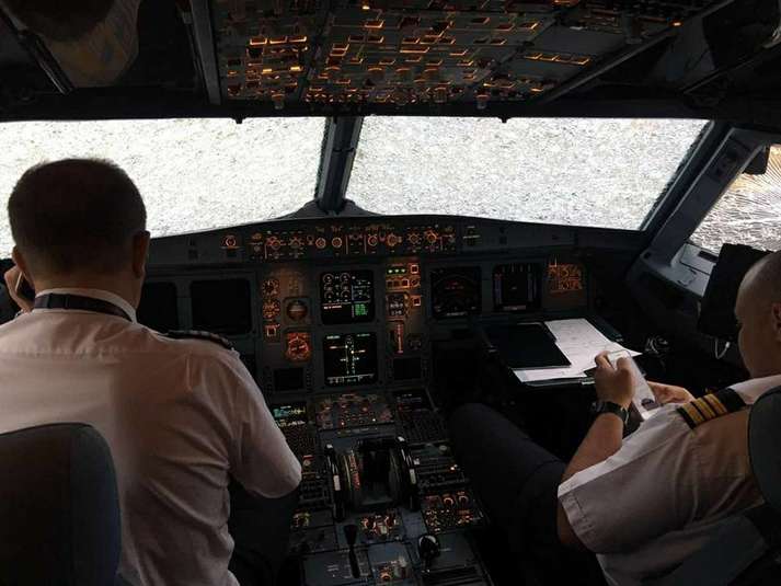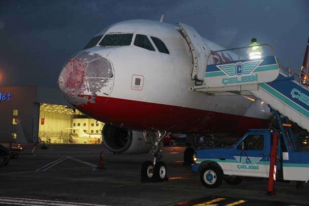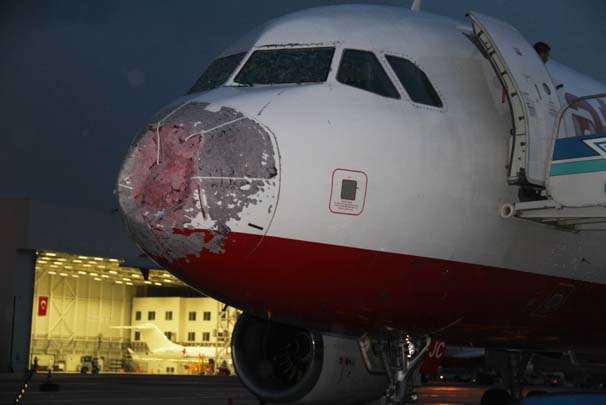 «Вчора в Стамбулі був ураган і град з куряче яйце. Літак турецької компанії Atlasglobal, пілотований українськими пілотами, потрапив в град. Внаслідок стихії повністю розбило ніс, переднє скло дуже постраждали, автопілот, автотраст, «Direct low».
