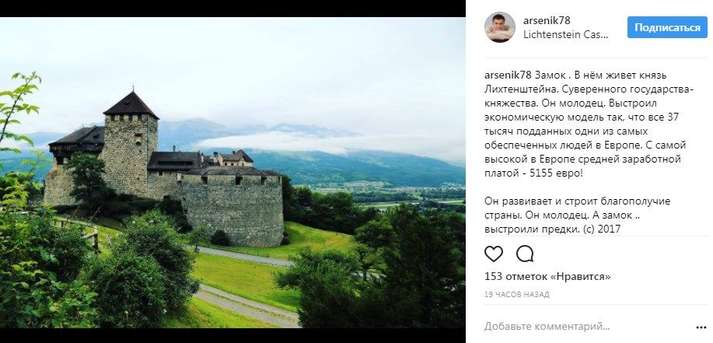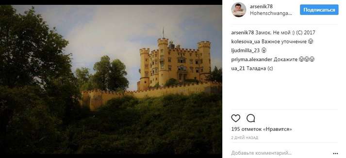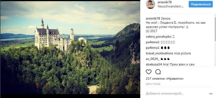 Крім швейцарського курорту, міністр опублікував фото старовинних німецьких замків Нойшванштайн і Хоеншвангау Ліхтенштейн.