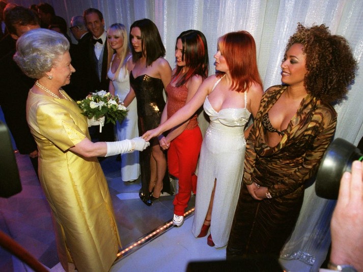 1997 року Єлизавета II відвідала концерт «Spice Girls» в лондонському театрі Victoria Palace Theater. Королева обрала для вечора стриману сукню з короткими рукавами і білі рукавички, а ось відомі співачки вбралися значно сміливіше.