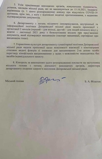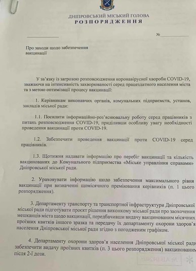 Міський голова Дніпра Борис Філатов підписав розпорядження, яким зобов'язав вакцинуватися від коронавірусу всіх співробітників мерії. Якщо хто-небудь відмовляється від щеплення, він зобов'язаний щотижня надавати за місцем роботи довідку з негативним ПЛР-тестом, як це заведено в мерії Нью-Йорка. Крім того, для вакцинованих другий дозою дніпрян мер також передбачив приємні бонуси.