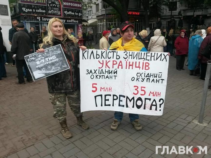 Як повідомляє кореспондент «Главкома», тут сталася невелика сутичка між учасниками акції і її противниками. Спочатку це була словесна перепалка, яка пізніше переросла у штовханину. Чоловік намагався зірвати «георгіївську стрічку» з літньої жінки.