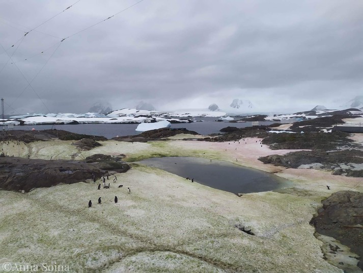За кольоровим снігом біля станції можна спостерігати наприкінці антарктичного літа. Таке забарвлення з’являється через розвиток у снігу мікроскопічних водоростей, які розмножуються спорами, не бояться екстремальних температур, тому зберігаються в снігу протягом усієї зими. Коли погодні умови стають сприятливими, спори починають проростати.