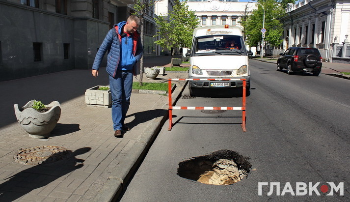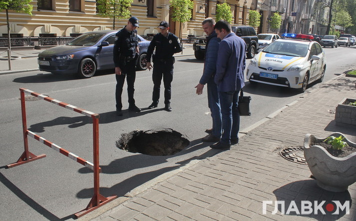 Сьогодні, 28 квітня в центрі Києва неподалік від Верховної Ради на проїжджій частині з’явилась величезна яма.