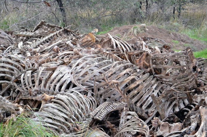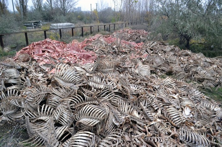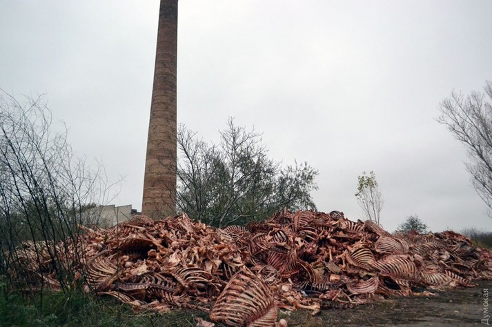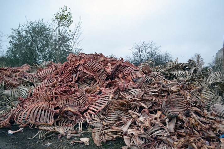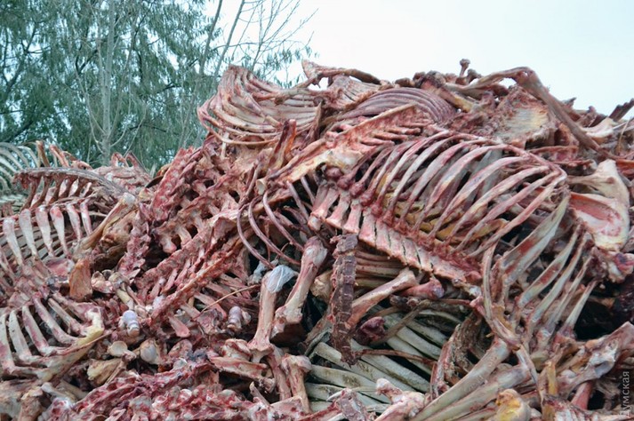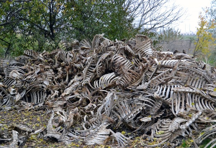 Гори коров'ячих скелетів, більшість з яких ще свіжі, зі слідами м'яса, знаходяться біля складу, розташованого неподалік від автобази. Машини з кістками заїжджають, скоріш за все, з боку автобази: звідти веде асфальтована дорога.