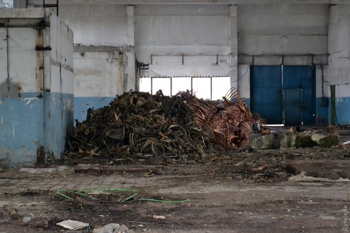 Всередині складу лежать великі купи обгризених туш. Смердить гнилим м'ясом, кричать ворони, на сусідньому заводі «Центроліт» заливаються гавкотом собаки.