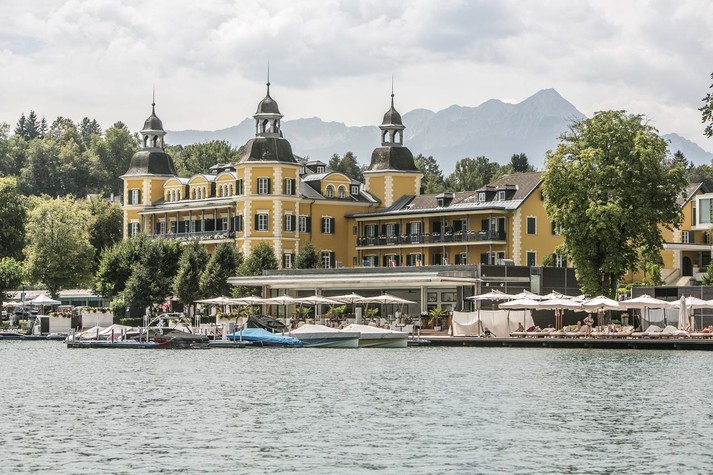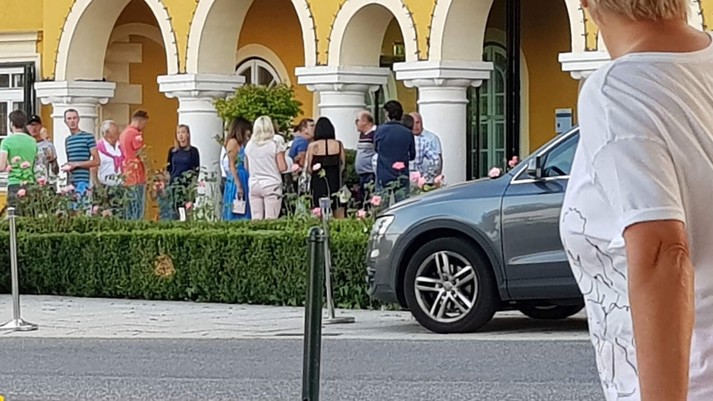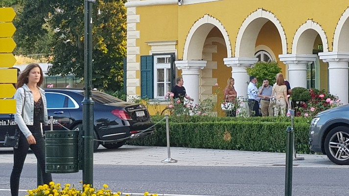 Знімки були зроблені 22 серпня під час виходу з найдорожчого готелю цього курорту - Schlosshotel Velden. Вартість номерів тут стартує від 550 євро на добу і доходить до більш ніж 2000 євро за ніч. У готелі є і казино.