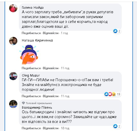 А далі пішло «громадське обговорення» користувачів, чи має так поводитися український депутат. Одні звинувачували його у нетолерантній поведінці через брехню. Інші відписували за схемою «а ми ж казали» і радили тепер тішитися обранцем, якого й вибрали добровільно. Та все ж більшості не сподобалася поведінка «слуги».