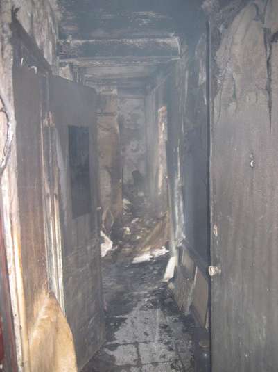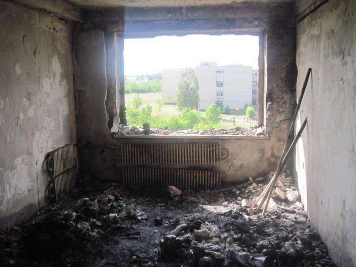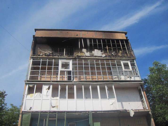 Поліцейські та співробітники ДСНС намагаються ліквідувати пожежу у багатоповерхівці Красногорівки, куди влучив снаряд. Жителі багатоповерхівки евакуйовані. Попередньо встановлено, що у квартирі, де розірвався снаряд та знаходиться епіцентр пожежі, людей не було.