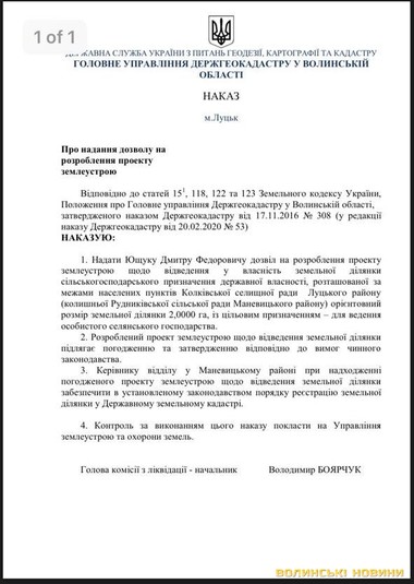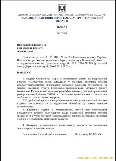 Так, керівник Головного управління Держгеокадастру Володимир Боярчук 2 квітня видав три накази на відведення земельних ділянок у власність загальною площею 6 га на території колишньої Рудниківської сільської ради Маневицького району (зараз –Колківська об’єднана громада).