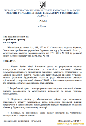 Ці ділянки отримали громадяни Стоянович Ігор Миколайович, Ющук Дмитро Федорович та Лукашук Галина Андріївна. Зокрема, йдеться про накази з реєстраційними номерами № 3–871/15–21-сг, № 3–874/15–21-сг та № 3–872/15–21-сг. Згодом керівник геокадастру області підписав ще один наказ про виділення 2 га на цій же території Бубен Марії Вікторівні.