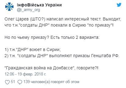 «За чиїм наказом? Є тільки два варіанти: 1) «ДНР» воює в Сирії; 2) «солдати ДНР» виконують накази Генштабу РФ. «Громадянська війна на Донбасі», кажете?»- написали в співтоваристві
