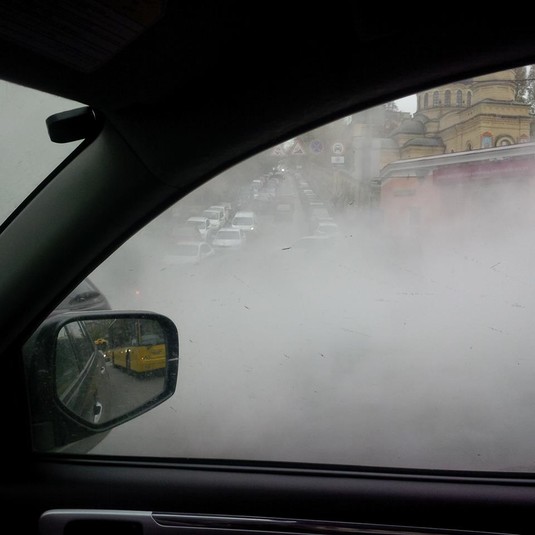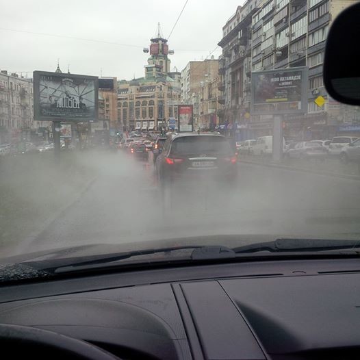 На фотографіях видно, що окріп тече прямо по проїжджій частині заповнюючи вулицю паром, через якого серйозно обмежена видимість.