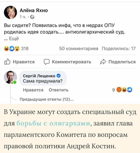 «Якщо навіть Сергуня Лещенко, невпинно вилизує Зеленського і вічно виправдовує всі його факапи, вважає створення антиолігархічного суду – вигадкою і маренням, то це означає, що слугам вдалося пробити чергове дно. Ці імітатори бурхливої діяльності хочуть лише влади і бабла. Доля України їх не цікавить. Вони тут жити не планують», – підкреслив нардеп.